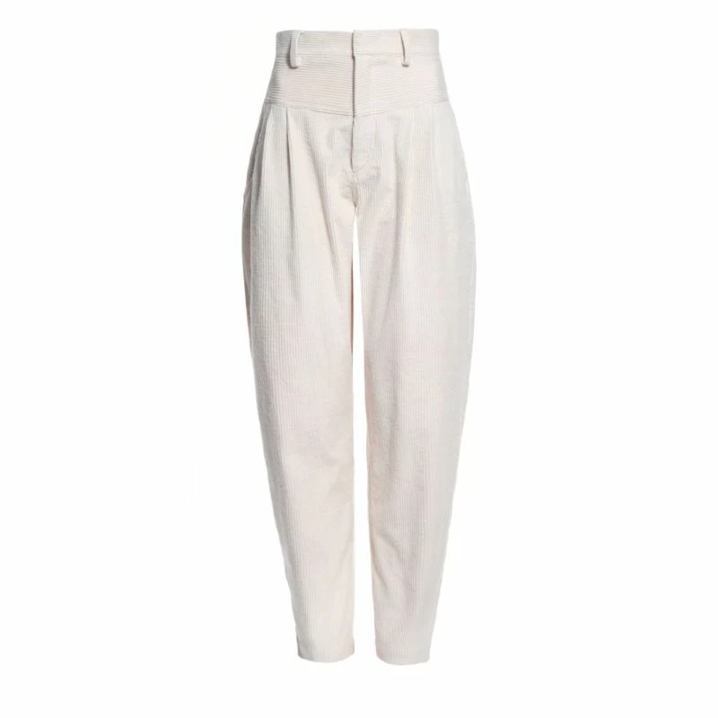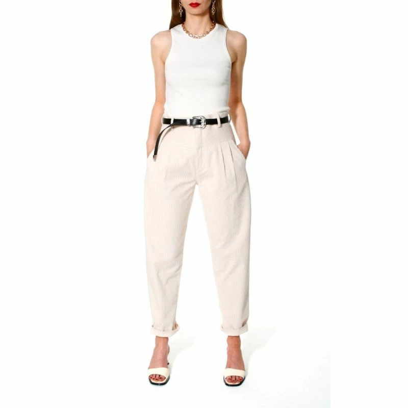 Front pleats are adding space, balloon thighs narrowing downwards.