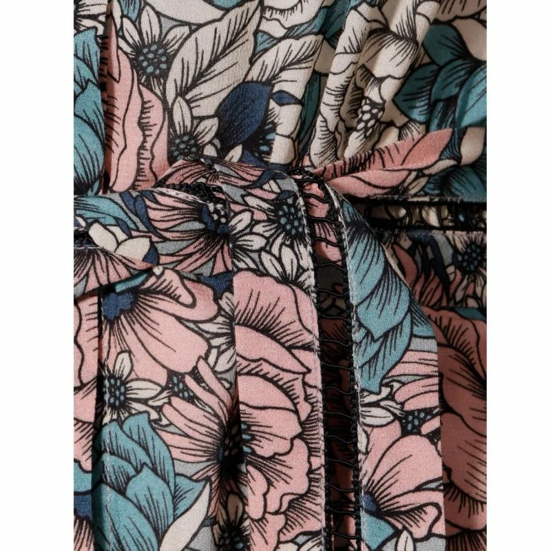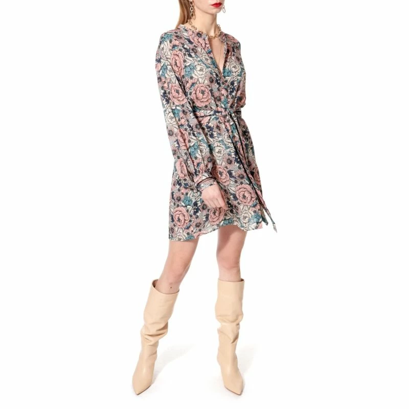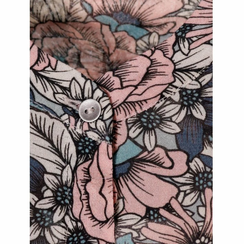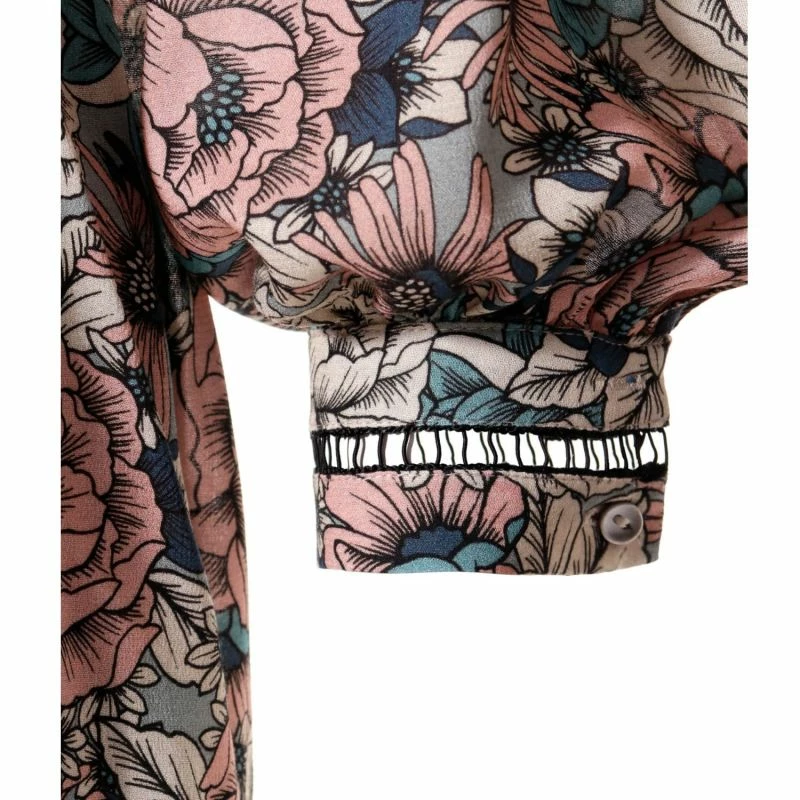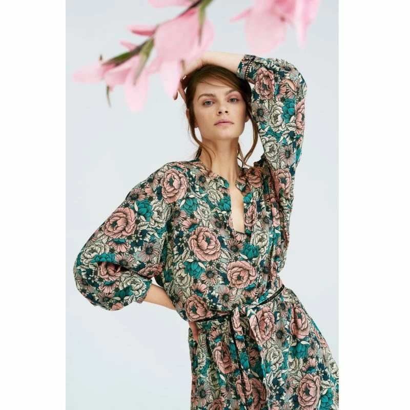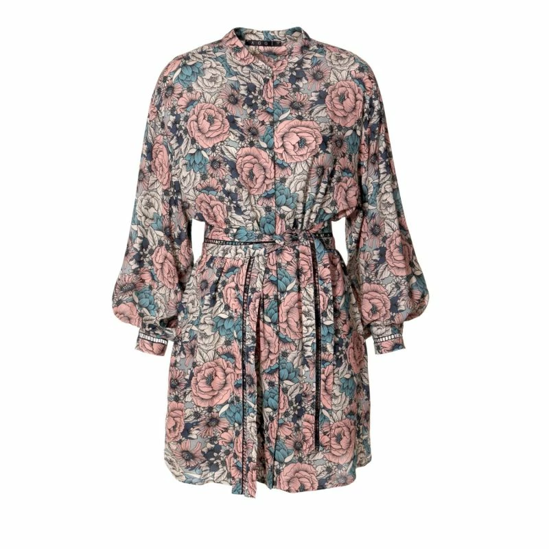 Shirt mini dress with a loose cut in a romantic boho style. Design made of viscose crepe with a romantic floral pattern – powder and cream roses graphically presented on a blue background. Extensive sleeve wrinkled into the cuff. Cuffs and belt decorated with a translucent black hemstitch insert. The whole is fastened with metal buttons in the colour of old silver. Pockets in the side seams. To elevate the look, wear it with combat boots.