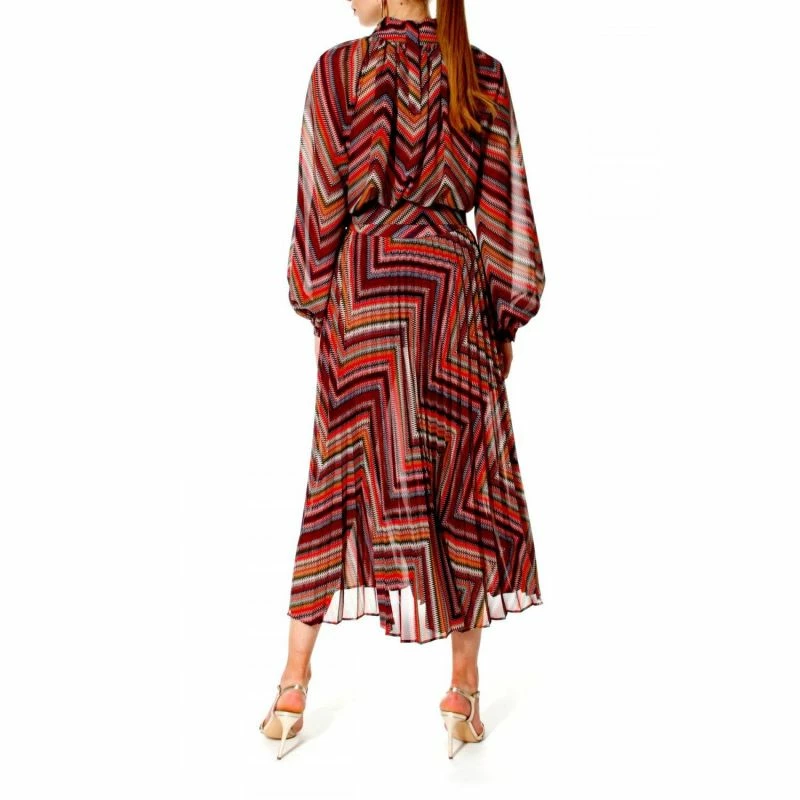 Elegant, feminine midi dress made of slightly thicker chiffon in a multicoloured geometric pattern. A mixture of burgundy, dark red, orange, olive green creates an eye-catching, unique print. Oversize, generous blouse richly crinkled at the neckline and cuffs. A belt is sewn in at the waist. Frilly, pleated bottom of the dress with a flared form. The waist is additionally highlighted by a wide, fabric-covered belt with a large buckle. Stand-up collar and cuffs fastened with tiny gold press studs. The design fits perfectly with high heels and suede boots.