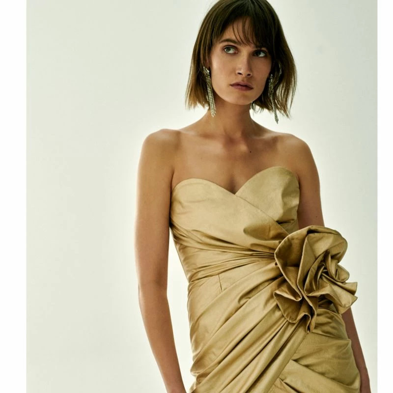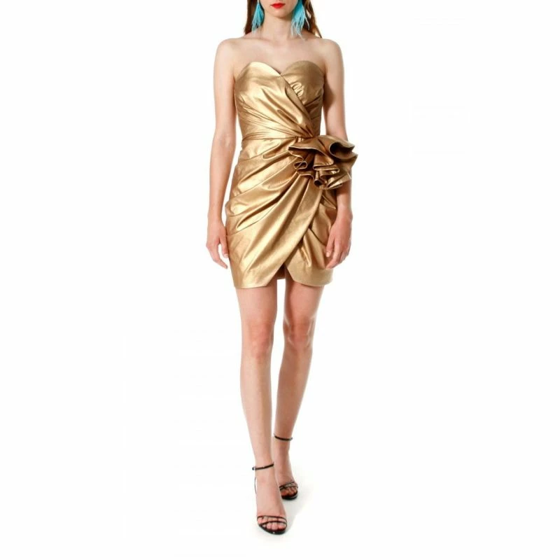 Extravagant mini dress made of delicate, high-quality vegan leather in a noble shade of light gold. Sculptural drapes and radially arranged pleats masterfully build the feminine silhouette of an hourglass. The thin, delicate vegan leather used in this design is covered with a cotton finish that is very skin-friendly. The dress has profiled bust cups and an underwire, which fits the design perfectly to the figure.