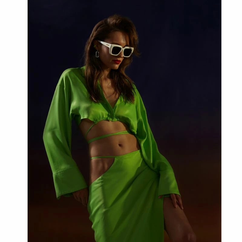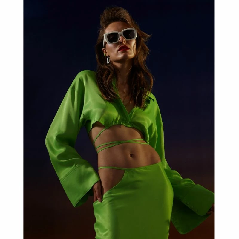 A satin blouse revealing the waist, tied with sensually crossed strings. With long sleeves finished with small coated buttons at the height of the voluminous cuffs. She will create a wonderful set with the Faye Green Flash skirt.