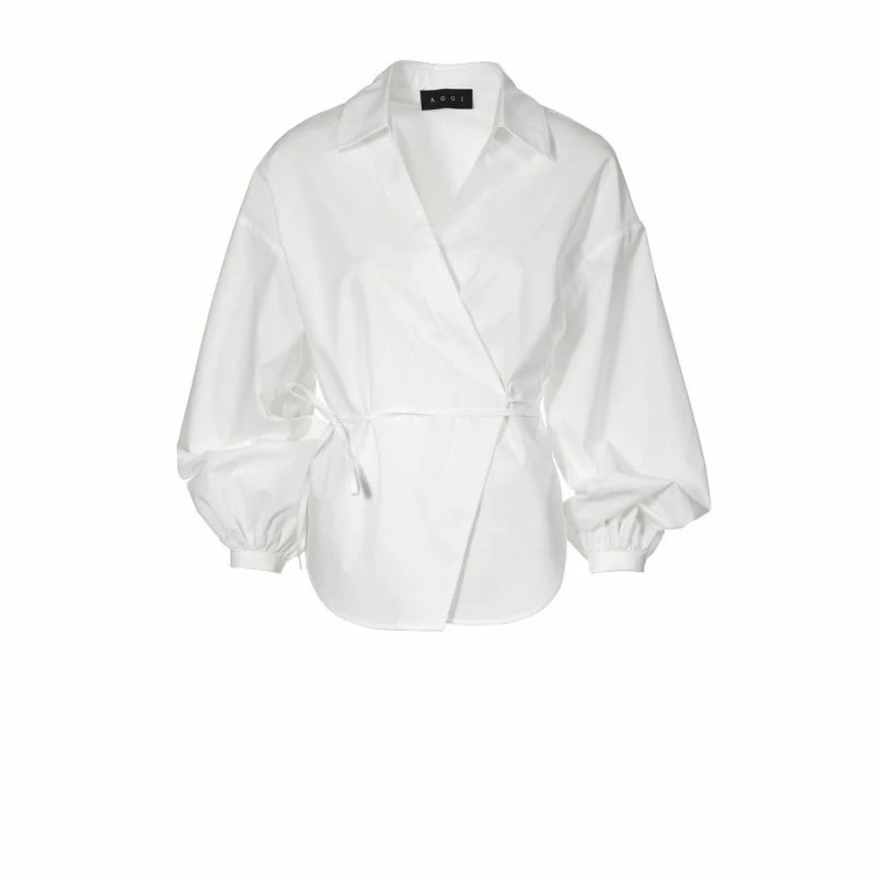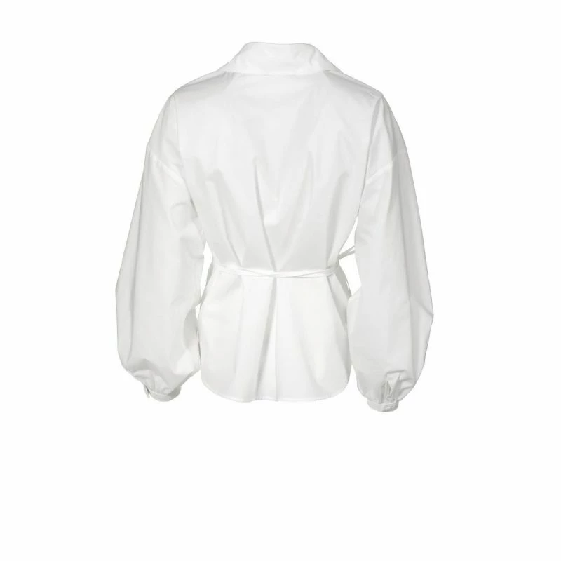 An envelope shirt blouse with V-neck. The design was sewn from 100% cotton with a slightly stiffer "paper" grip, thanks to which the cut maintains a spatial effect. Blouses tied with long strings that give you the ability to adjust the depth of the neckline as well as fancy tying at the waist and emphasize the waist. Lowered shoulder line and wide, spacious balloon sleeves gathered by a narrow cuff at the wrist. The sharp-shaped collar gives the design a firm character. The shirt looks great inserted inside the pants or skirt and also worn lined outside and nonchalantly tied with straps.