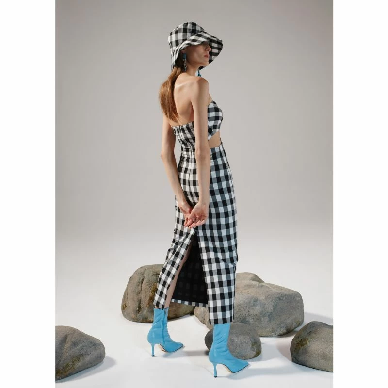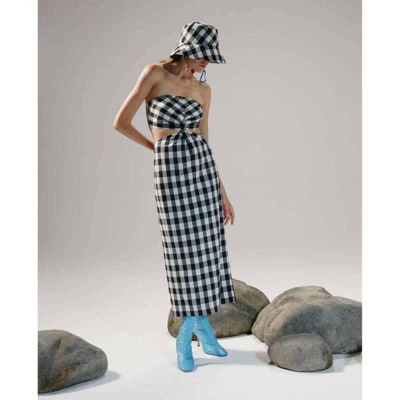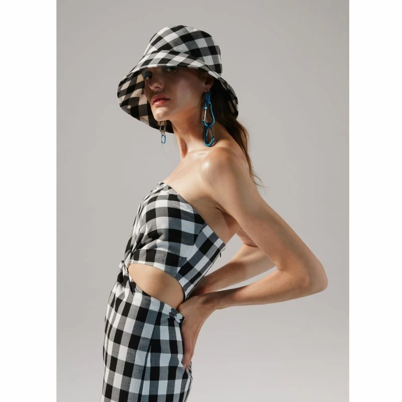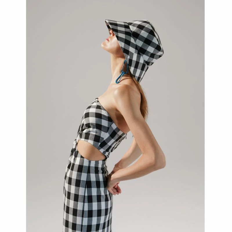 Corset midi dress with sensual cut-outs revealing the waist. Slightly austere monochrome black and white Vichy check in an interesting way emphasizes the feminine and sexy line of a tightly fitting design. Decorative knot at the front. Everything on a delicate cotton lining. Wear it with out cute accessory bucket MIA hat.