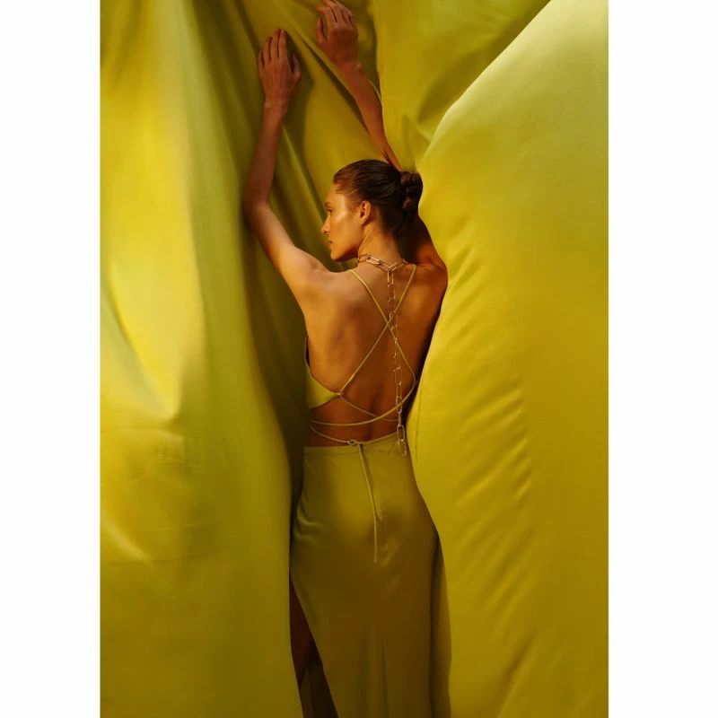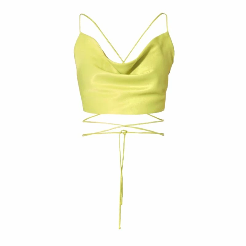 Tight crop top with open back made of fleshy noble satin in a lime shade. The intricate binding of thin macaroons stripes crossing the back and around the waist creates a delicate design perfect for a summer party. Will make a perfect match with Gal Wild Lime Skirt.