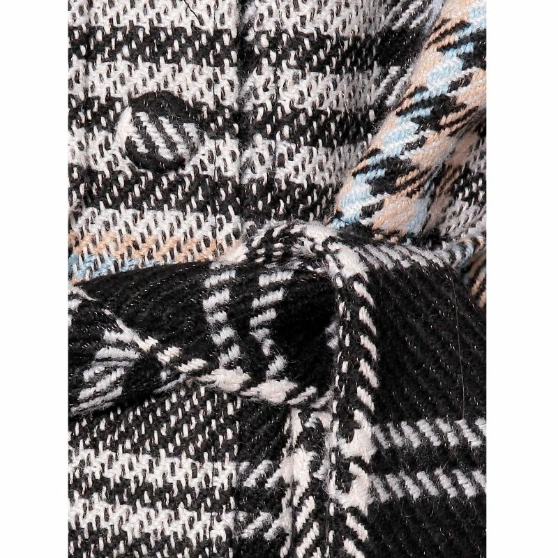 Maxi coat with an expressive check inspired by the cut of a sports shirt. The characteristic stand-up collar finished with black varnished vegan leather. Large, decorative patch pockets with flaps at the front and practical hidden pockets in the side seams. The oversize cut and the checkered pattern make the design elegant and casual at the same time. The sleeve with a looser armpit allows you to freely wear a jacket or a wider sweater under a coat. Waist tied with a wide belt. Fastened with silver-coloured metal clasps on the outside, covered with checkered fabric. The coat looks great when worn without a belt. Everything on a jacquard lining in a mosaic golden-blue pattern.