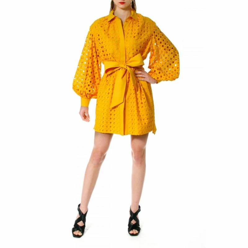 Delicate lace and puffed sleeves give the dress lightness and a romantic look.