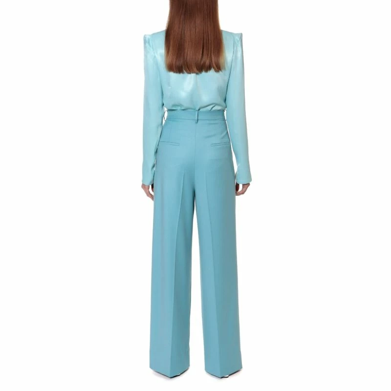 Shirt made of fleshy, noble satin in a soft sky blue colour. Pointy shoulders slightly accented with small padding. Covered fastening with subtle small buttons. Long sleeves with slits at the wrists. For an complete elegant look combine it with GWEN HOW BLUE AM I and BLAIR HOW BLUE AM I BLAZER.