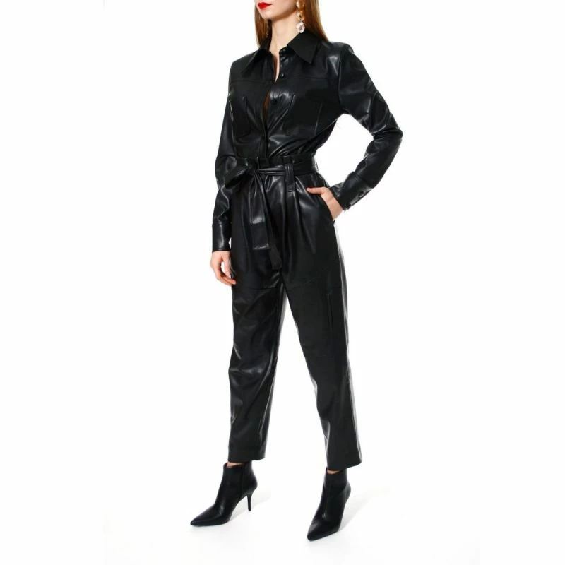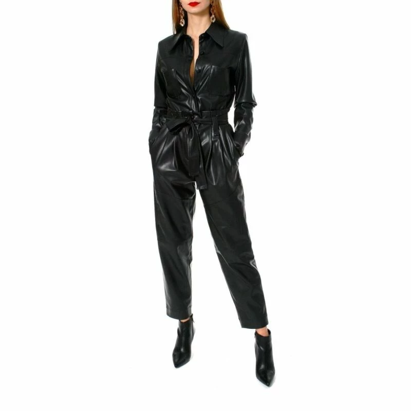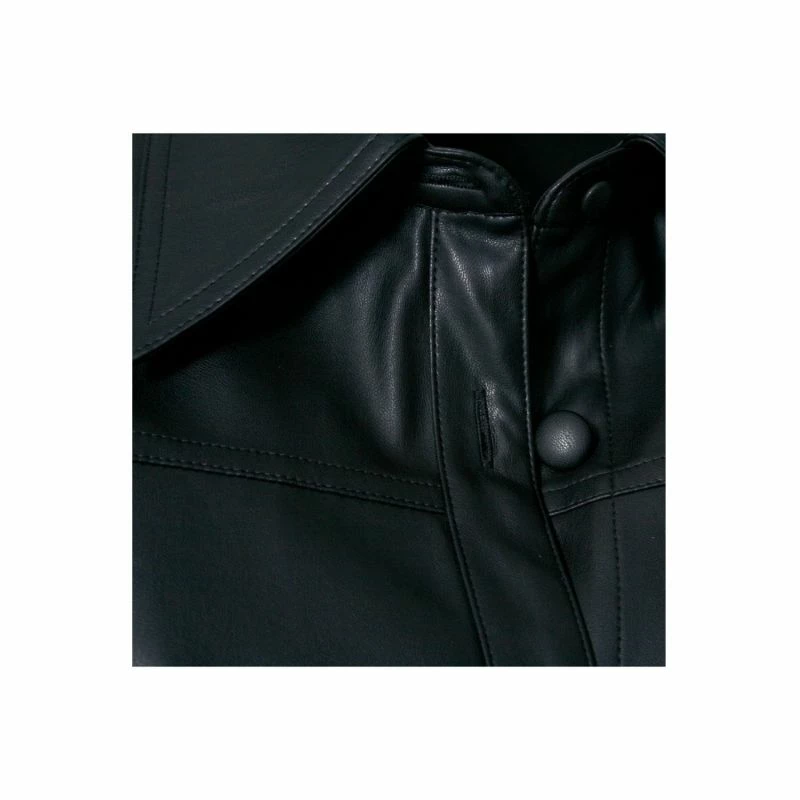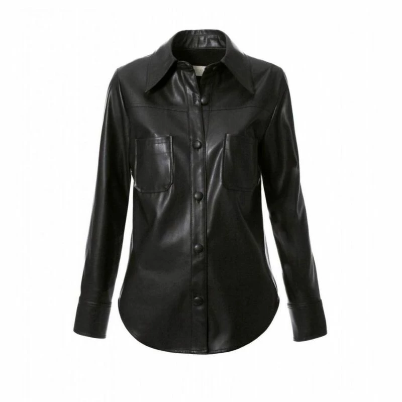 Shirt made of soft, delicate, high-quality vegan leather. The project maintained in the atmosphere of the 70s. With a pointed, stand-up collar and long sleeves finished with narrow cuffs fastened with covered buttons. Meticulously refined details, small, put-on pockets on the front of the blouse, decorative quilting, buttons covered with vegan leather.