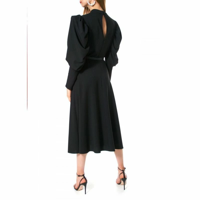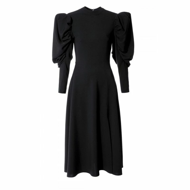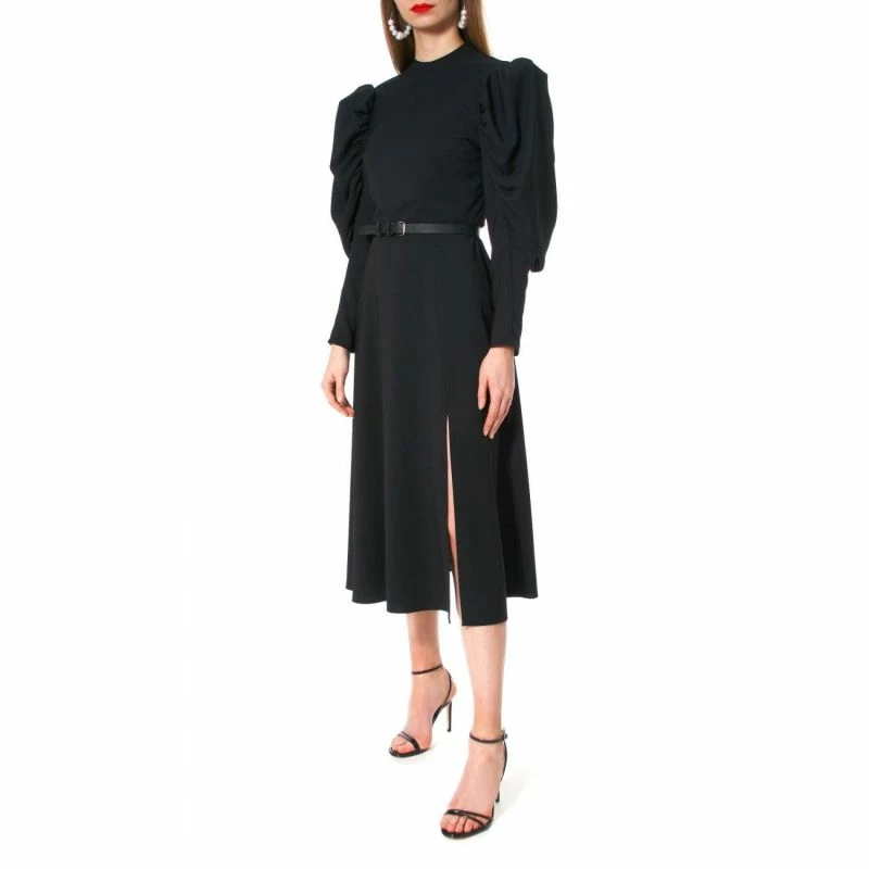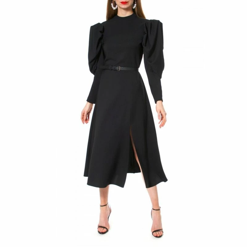 Midi dress made of meaty, softly fitting fabric of medium thickness with the addition of elastane. Neckline with stand-up collar. Generous, puffed sleeves with a sewn-in wing. The bottom of the wedge dress widened with a slit on the left leg.